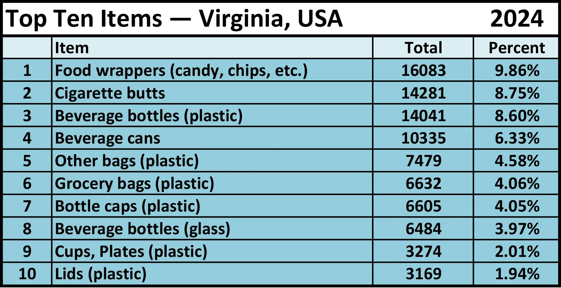 Plastic items dominated the 2024 Virginia ICC Top Ten list. We put the data to work to find answers and solutions. Up to 80% of debris in the oceans comes from land: mismanaged waste, litter, illegal dumping, and uncovered trucks. Data collected by volunteers during the ICC in Virginia is summarized in reports, which are shared with policy makers. Organizations across Virginia use this information to develop educational campaigns as well as policies and laws.