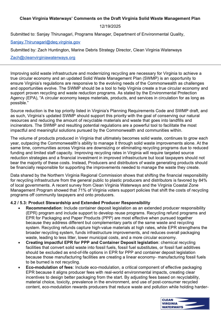 n December 2025, CVW submitted comments on the draft SWMP emphasizing extended producer responsibility (EPR) and beverage container refund programs. The comments advocate for a true circular economy and caution against using state funds for “advanced” or chemical recycling, which are regulated as manufacturing and classified as incineration in Virginia, urging proven source-reduction approaches instead.
